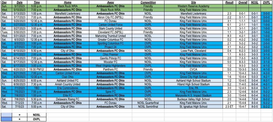 2023 Season May 27, 2023 6 - 1 N/A Ambassadors Ohio U23 vs Canton Force June 3, 2023 2 - 1 N/A Ambassadors Ohio U23 vs Sporting Columbus June 7, 2023 3 - 1 N/A Ambassadors Ohio U23 vs SVA Project 24 June 11, 2023 1 - 1 N/A Ambassadors Ohio U23 vs Ohio Premier June 17, 2023 1 - 0 N/A Ambassadors Ohio U23 vs WV Highlanders June 21, 2023 1 - 1 N/A Ambassadors Ohio U23 @ Canton Force June 21, 2023 1 - 6 N/A Ambassadors Ohio U23 @ Club Ohio July 1, 2023 3 - 0 N/A Ambassadors Ohio U23 @ Erie Commodores FC July 5, 2023 2 - 3 N/A Ambassadors Ohio U23 vs Spire FC July 8, 2023 3 - 0 N/A Ambassadors Ohio U23 vs Elite FC Schedule and Results Player Stats